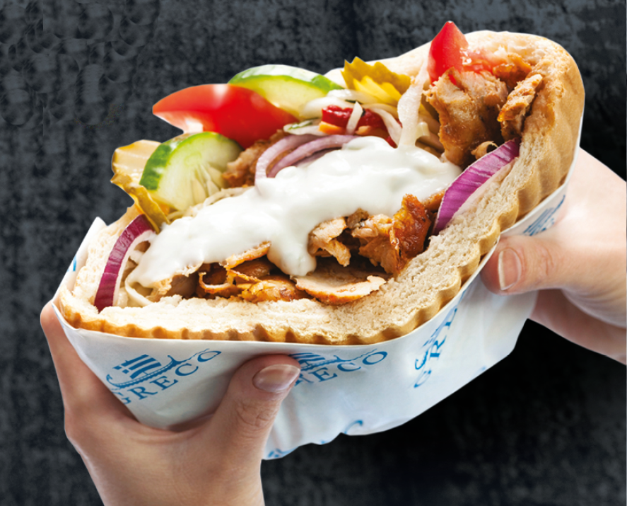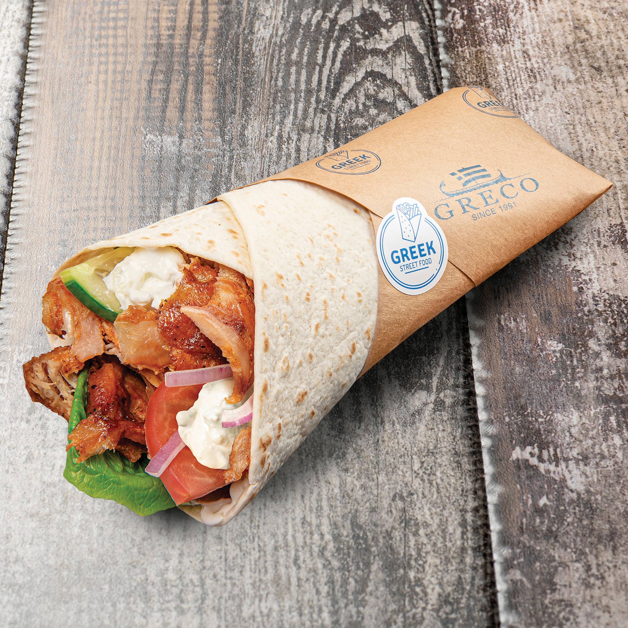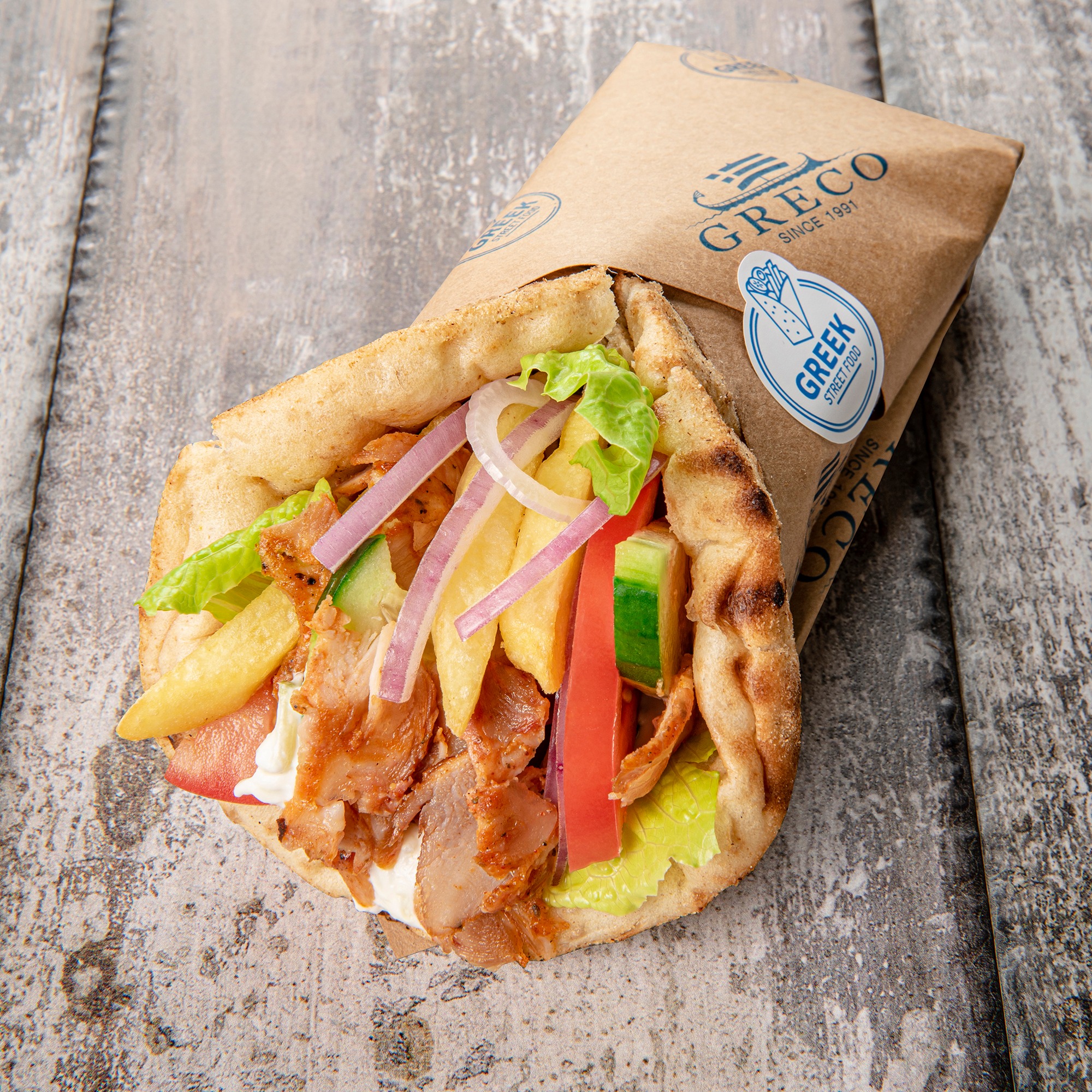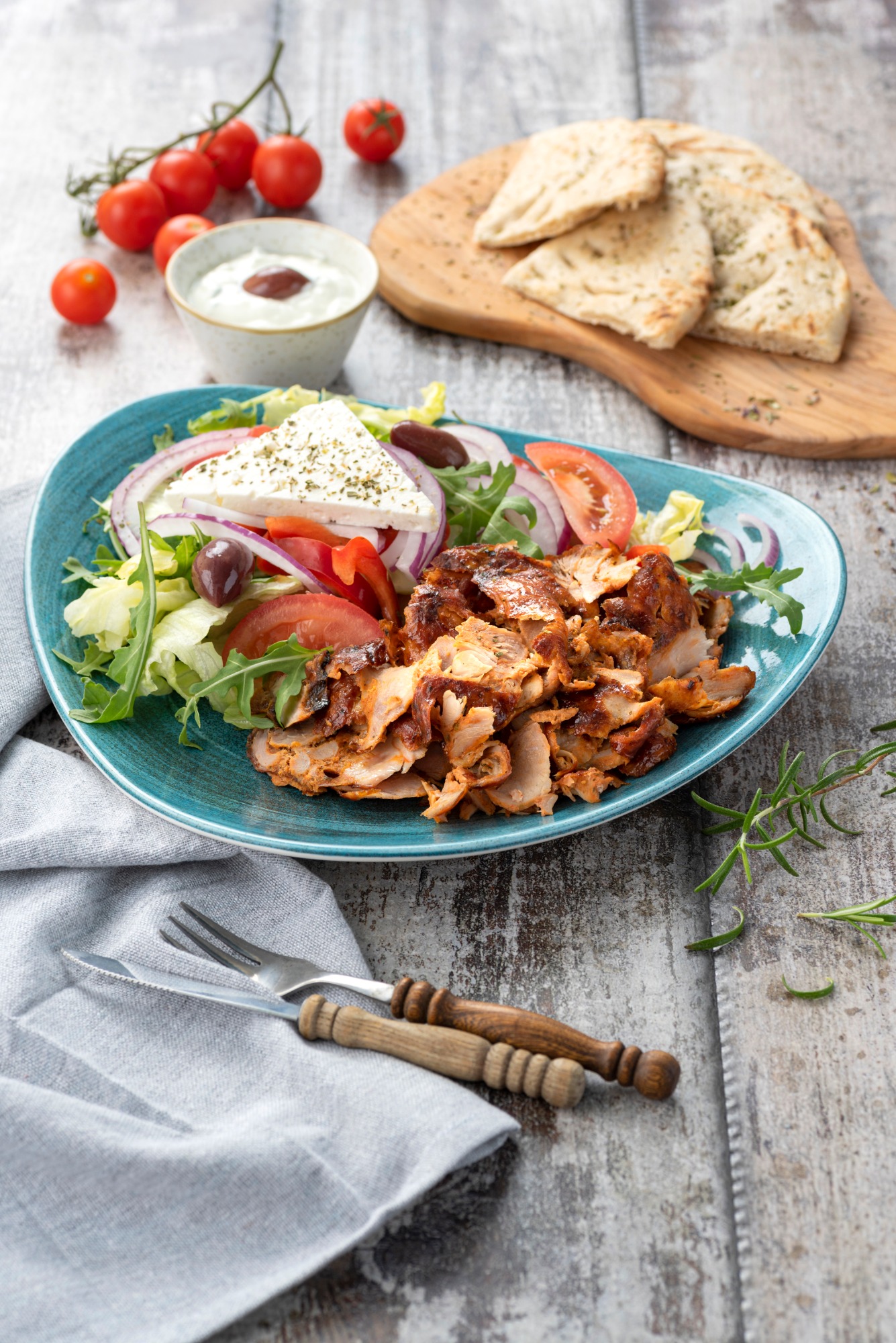 Grecki Gyros z kurczaka - przygotowywany wyłącznie z mięsa kurcząt z polskich hodowli. Harmonijna kompozycja różnych części kurczaka zapewnia oryginalne walory smakowe, co sprawia iż jest to jedno z najlepiej sprzedających się dań w naszych restauracjach.